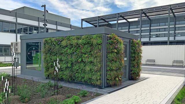 Die Netzersatzanlage – untergebracht in einem grauen Flachbau mit begrünter Fassade – soll südlich vom Rathaus angrenzend an den Carport anstelle von zwei Parkplätzen installiert werden. Von dort werden entsprechende Kabelanschlüsse in das Rathaus geführt. „Die Anlage ist so ausgelegt, dass sie den Gebäudetrakt mit Strom versorgt, in dem sich zwei Küchen, der Mehrzweckraum, ein Mitarbeiter- und der Serverraum befinden“, sagt Stadtsprecherin Andrea Steding. Mit der von der Stadt gewünschten Fassadenbegrünung passe sie gut zu dem verklinkerten Carport.