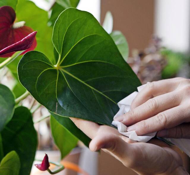 Staub sieht nicht nur unschön aus, er kann den Pflanzen auch schaden: Sie bekommen nicht mehr genug Licht für ihre Photosynthese – und wachsen womöglich schlechter. Die Plants & Flowers Foundation Holland rät deshalb, Zimmerpflanzen regelmäßig, beispielsweise einmal im Monat, abzustauben. Bei großblättrigen Pflanzen kann man dafür ein feuchtes, weiches Tuch verwenden. Das jeweilige Blatt stützt man demnach beim Wischen am besten mit der freien Hand ab, damit man so sanft wie möglich vorgehen kann.