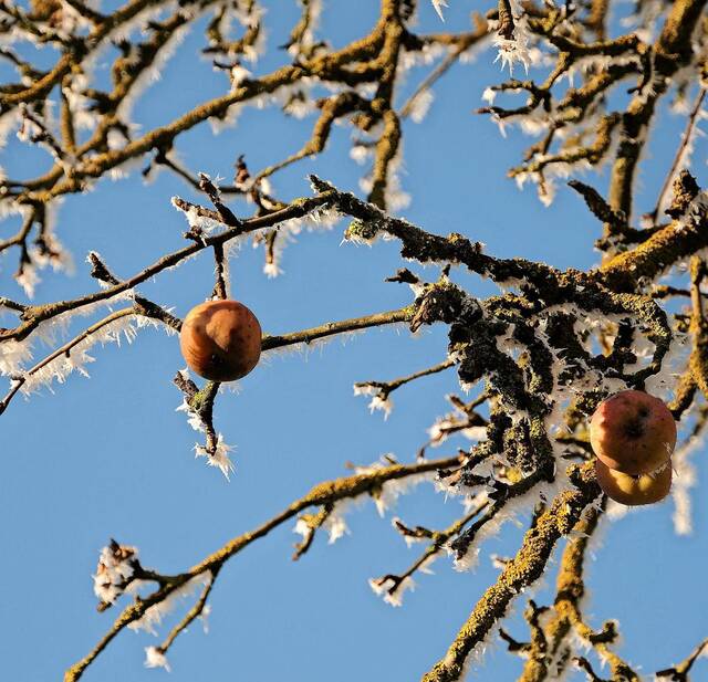 Die Luft ist glasklar, der Himmel tiefblau, und die Wintersonne lässt gefrorene Tropfen in den Ästen funkeln wie winzige Lichterketten. Für die einen ein zauberhaftes Bild – für Hobbygärtner ein Grund zur Sorge. Zu harter Frost kann die anstehende Obsternte buchstäblich auf Eis legen. Ganz verhindern lasse sich die Frostgefahr nicht, sagt Heinrich Beltz, Gartenbauingenieur und Versuchsleiter in der Landwirtschaftskammer Niedersachsen. Aber: Wer rechtzeitig vorsorge, könne seine Obstbäume gut durch die kalte Jahreszeit bringen.