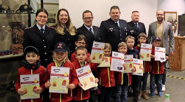 Martin Schmidt berichtete anschließend über die Kinderfeuerwehr „Löschzwerge“. Mit 23 Kindern sei der Mitgliederbestand leicht gestiegen. An 26 Diensten wurden die Kinder spielerisch an die Arbeit der Feuerwehr herangeführt. Ausflüge, ein Zoobesuch und das Kürbisschnitzen zu Halloween ergänzten das Programm. Ein besonderer Höhepunkt war das 20-jährige Bestehen der Kinderfeuerwehr, das mit einem Spaßmarsch gefeiert wurde. Im Anschluss wurden Auszeichnungen verliehen. In der Kinderfeuerwehr erhielten 18 Kinder das Kinderflämmchen in den Stufen eins bis vier, in der Jugendfeuerwehr wurden 13 Jugendflammen der Stufe eins überreicht. In ihren Grußworten hoben Ortsbürgermeister Martin Jausch, Ortsbrandmeister Florian Hohnroth und der stellvertretende Stadtjugendfeuerwehrwart Marcus Pauli die Bedeutung der Nachwuchsarbeit hervor.