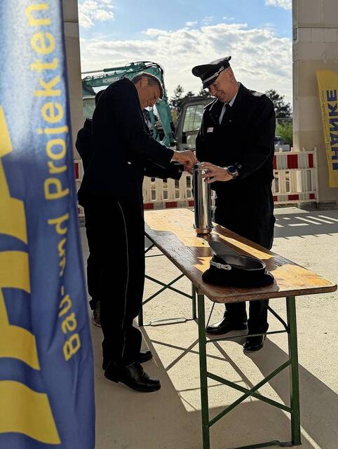 Zur Zeremonie kamen neben Bürgermeister Kai Eggert Vertreterinnen und Vertreter der Ortsfeuerwehr mit Einsatz-, Kinder- und Jugendabteilung sowie der Alters- und Ehrenabteilung, zudem Gäste aus Politik, Verwaltung, beteiligten Firmen und der Nachbarschaft. In den Grundstein wurde eine Zeitkapsel eingelassen, die unter anderem Bauunterlagen, aktuelle Tageszeitungen, Münzen sowie ein Gruppenfoto der Feuerwehr enthält. Ergänzt wird der Inhalt durch eine Mitgliederliste, eine Florian-Münze und ein Schreiben an künftige Finder. Eine Tafel soll später an die Einmauerung erinnern. Beim symbolischen Vermauern äußerten Bürgermeister Kai Eggert, Unternehmensgeschäftsführer Olaf Küpper und Ortsbrandmeister Frank Bezdiak ihre Wünsche für einen erfolgreichen Bauverlauf und die künftige Nutzung. Eggert erklärte: „Dieser Grundstein wird gelegt im Vertrauen auf die Zukunft und den unermüdlichen Einsatz unserer Feuerwehr.“ Küpper betonte den Wunsch nach einem unfallfreien Bauablauf, während Bezdiak das Gebäude als Ort der Sicherheit und Kameradschaft hervorhob.