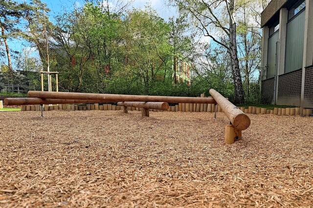 Zentrales Element der Anlage ist eine etwa 7,2 Meter hohe Seilpyramide in Orange und Blau. Ergänzt wird das Angebot durch eine Mikado-Wippe sowie einen Balancierbalken. Für ruhigere Aufenthalte stehen Holzbänke, Baumstämme und Natursteine bereit. Zwei junge Hainbuchen und Haselnuss-Sträucher strukturieren das Gelände, das durch niedrige Einfassungen aus Holzstämmen gegliedert ist. Die stellvertretende Schulleiterin Melanie Winter äußerte sich positiv zu den Veränderungen: „Unsere Schülerinnen und Schüler warten schon gespannt auf die neue Spielfläche. Hier wird ihnen neben Spiel und Spaß an altersgerechter Bewegung auch das Trainieren ihrer motorischen Fähigkeiten geboten! Und unsere Schulgemeinschaft freut sich sehr, dass mit der Einweihung der neuen Spielgeräte und der gestalteten Außenanlage gleichzeitig die Fertigstellung unseres Gebäudekomplexes gefeiert werden kann - und das in unserem Jubiläumsjahr!“
