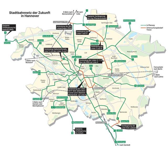 Außerdem soll die Linie 1 von der jetzigen Endstation bis Langenhagen/Pferderennbahn fortgeführt werden. Frühestens 2026 könnte das Vorhaben planerisch vorangetrieben werden. „Die Trasse ist freigehalten“, sagt Infra-Chef Weske. Franz verweist auf eine neue Machbarkeitsstudie, die derzeit unter Einbindung der Stadt Langenhagen durchgeführt wird.