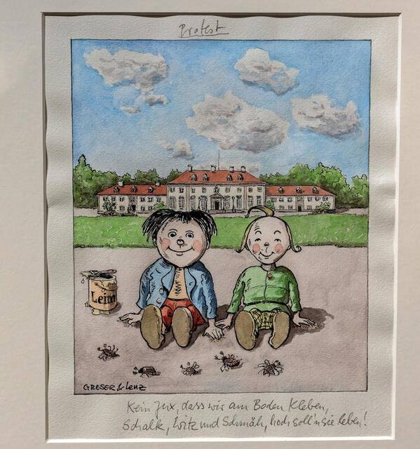 So zeichnete Ronald Searle in „Café am Kröpcke“, wie Max und Moritz genüsslich Torte schlemmen. Und die Karikaturisten Greser & Lenz porträtierten die beiden vor dem Busch-Museum. Wie bei einem Klimaprotest haben sie sich dort mit Leim am Boden festgeklebt. Darunter steht ein Zweizeiler: „Kein Jux, dass wir am Boden kleben, / Schalk, Witz und Schmäh, hoch soll‘n sie leben!“