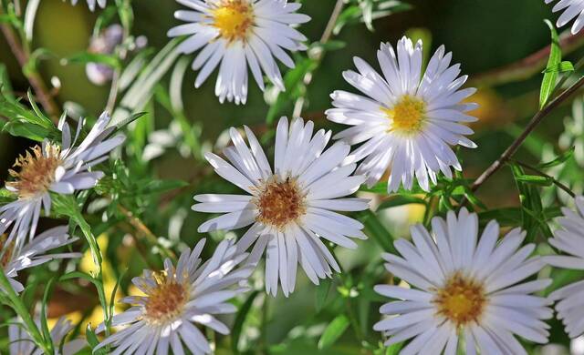 Rein-weiß mit gelber Mitte sind die Blütensternchen der Wald-Aster (Aster divari-catus), die auch an schwierigen Standorten gedeiht. Sie ist im Oktober häufig schon verblüht und bildet dafür hübsche Samenstände, die das Staudenbeet auch im Winter schmücken. Da sie sowohl Halbschatten als auch die Konkurrenz anderer Wurzeln toleriert, gilt sie als guter Bodendecker unterhalb von Bäumen.