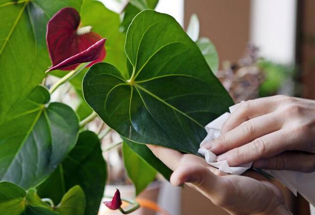 Staub sieht nicht nur unschön aus, er kann den Pflanzen auch schaden: Sie bekommen nicht mehr genug Licht für ihre Photosynthese – und wachsen womöglich schlechter. Die Plants & Flowers Foundation Holland rät deshalb, Zimmerpflanzen regelmäßig, beispielsweise einmal im Monat, abzustauben. Bei großblättrigen Pflanzen kann man dafür ein feuchtes, weiches Tuch verwenden. Das jeweilige Blatt stützt man demnach beim Wischen am besten mit der freien Hand ab, damit man so sanft wie möglich vorgehen kann.