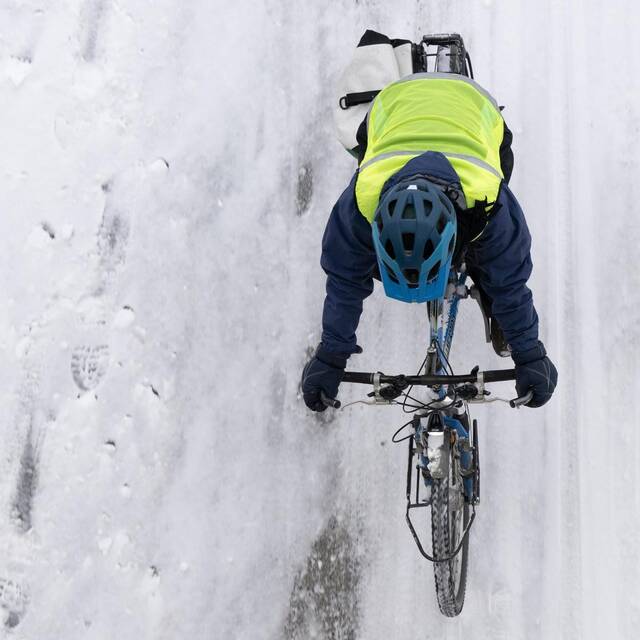Besonders wichtig ist es, die Extremitäten zu schützen: Moesgard empfiehlt, entweder zwei Paar Handschuhe übereinander zu ziehen oder sogenannte Hummerhandschuhe mit drei Fingern zu tragen. Überschuhe sowie Fell- und Heizsohlen halten die Füße dauerhaft warm. Den Hals schützt ein Buff, unterm Helm sollte eine Mütze aufgesetzt werden. Für gute Sichtbarkeit sorgten Anstecklichter vorn und hinten am Rad sowie helle, reflektierende Kleidung, erklärt Böhme: „Meine Neonweste hat mir schon oft das Leben gerettet.“