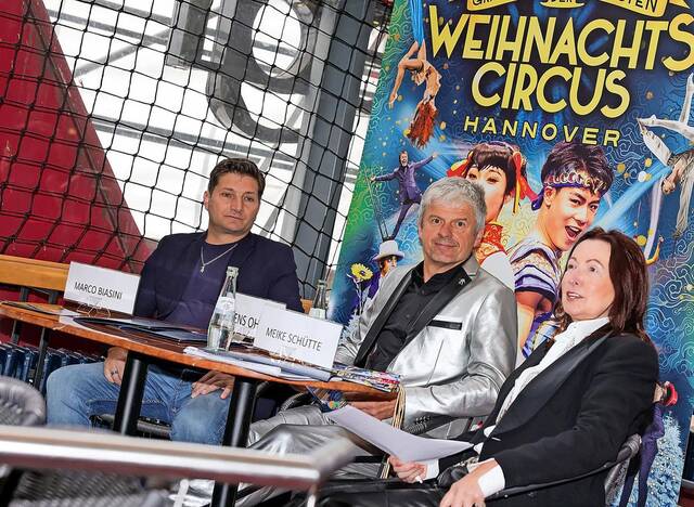 Pressekonferenz im Theater am Aegi: (von links) Marco Biasini, Jens Ohle und Meike Schütte stellen das Programm für den diesjährigen Weihnachtscircus vor.Foto: Ilona Hottmann