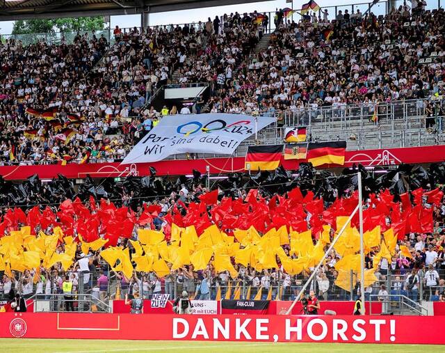 Party in Hannover vor gut 44.000 Fans: Beim letzten Frauen-Länderspiel in Hannover im Juni 2024 feierten die Fans den Abschied des damaligen Nationaltrainers Horst Hrubesch. Und ein 4:0 gegen Österreich in der EM-Qualifikation.Foto: IMAGO/Eibner