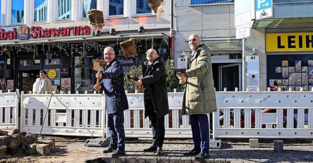 Den ersten Spatenstich für das Projekt setzten Oberbürgermeister Onay, Baudezernent Thomas Vielhaber (SPD) und Architekt Stefan Grieger allerdings ein gutes Stück vom eigentlichen Steintorplatz entfernt. Denn die Arbeiten starten an der Kurve südlich vom Bratwurst Glöckle. Von dort soll der erste Bauabschnitt Richtung Münzstraße fortgeführt werden. Die Stadt geht davon aus, dass dieser bis zum Spätherbst 2026 abgeschlossen sein wird. Weitergehen soll der Umbau anschließend am Nordende des Platzes und sich von dort Schritt für Schritt Richtung Platzmitte fortsetzen. Insgesamt rechnet die Stadt mit einer Bauzeit von rund zwei Jahren. Ende 2027 oder Anfang 2028 soll der neue Steintorplatz fertig sein. Bis dahin wird es immer wieder Sperrungen von Flächen auf oder am Steintorplatz geben. Die Kosten für den Umbau kalkuliert die Stadt mit rund 7,5 Millionen Euro.Ein Projekt, das einen langen Vorlauf hatte. Ursprünglich wollte die Stadt – damals noch unter der Regie von Baudezernent Uwe Bodemann – zwei große Gebäude auf dem Steintorplatz errichten. Dagegen gab es heftigen Widerstand aus der Bevölkerung. Die Verwaltung führte daraufhin eine umfangreiche Bürgerbeteiligung zur Zukunft des Steintors durch, die 2019 ihr Ende fand. 2020 entschied das Landschaftsarchitekturbüro Grieger Harzer aus Berlin den Wettbewerb für die Gestaltung des Platzes für sich.