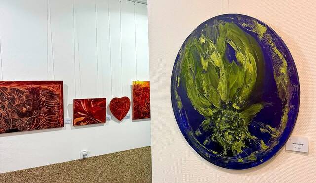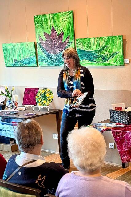 Die Künstlerin stellte ihre Werke vor und beantwortete neugierige Fragen zu ihrer Technik: Mit dem Bügeleisen trägt sie heißes Wachs auf Leinwände auf. Enkaustik nennt sich die Wachsmalerei, die schon im alten Ägypten zu finden war. „Ich gehe intuitiv vor“, so Karin Oppermann. Sie lasse sich von den Materialien, Farben und spontanen Ideen leiten. Ausdrucksstarke Arbeiten entstehen so, die an spirituelle Symbole erinnern. Davon zeugen auch kurze Texte zu jedem Bild, die Karin Oppermann mit dem Programmheft verteilte. Zum Bild „Lotus“ heißt es dort etwa: „Die Lotusblume überwindet den schlammigen Grund, aus dem sie emporwächst und trägt wunderschöne Blüte. So steht sie sinnbildlich für den Weg aus dem Leid.“ Die Künstlerin lebt und arbeitet in Giesen und in ihrem Atelier im Kunsthaus Nordstemmen.