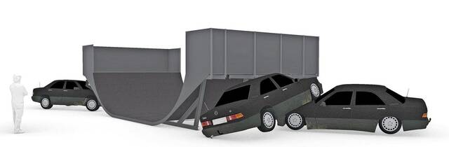 Die Installation trägt den Titel „CRASH PIPE (2026)“ und ist alles andere als eine gewöhnliche Skateanlage. Die Konstruktion besteht aus rund acht Tonnen Metall und wird von ausrangierten Autos getragen, auf die sich Titel der Arbeit bezieht. Das Ergebnis erinnert an ein überdimensioniertes Bühnenbild – allerdings nicht in einem Theater, sondern mitten in der Stadt.