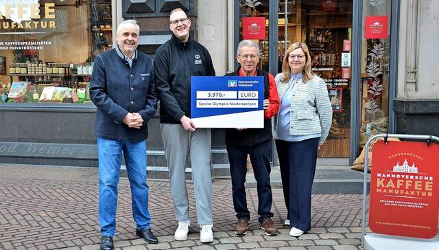 Das Ergebnis dieser Initiative kann sich sehen lassen: Für die Jahre 2024 und 2025 kamen insgesamt 3.970 Euro zusammen, die nun offiziell übergeben wurden. Andreas Berndt, Geschäftsführer der Hannoverschen Kaffeemanufaktur, und Anne Mahler, stellvertretendes Vorstandsmitglied der Hannoverschen Volksbank, überreichten den Betrag an Vertreter der Organisation. Die Freude darüber war groß – sowohl bei Vize-Präsident Uwe Lübking als auch bei Athletensprecher Kevin Struß.