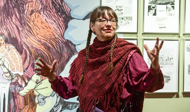 „Die Frau als Mensch“: Ulli Lust im Wilhelm-Busch-Museum vor Bildern aus ihrem preisgekrönten Comic-Sachbuch.Foto: Nancy Heusel