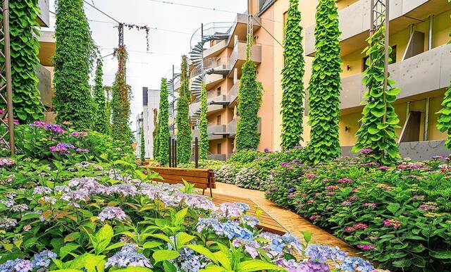 Öffentlich zugänglich ist dieser Innenhof nicht, um den sich 44 Wohnungen gruppieren. Doch er leistet seinen Beitrag zum Stadtklima. „Wir brauchen Pflanzen, die uns helfen, die City abzukühlen“, erklärt der Fachmann und verweist auf die inzwischen hüfthoch wachsenden Hortensien, deren Blüten im Sommer acht Wochen lang Farbenpracht in blau, violett, weiß und rosa in den Hof gebracht haben.