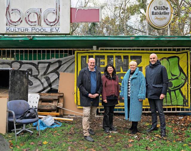 Traditionsreicher Ort: Béi-Chéz-Heinz-Geschäftsführer Jürgen Grambeck (von links), Kulturmanagerin Susii Liere, Dezernentin Susanne Blasberg-Bense und Oberbürgermeister Belit Onay vor dem neuen Club-Domizil im ehemalige Musiktheater Bad.Foto: Jonas Dengler