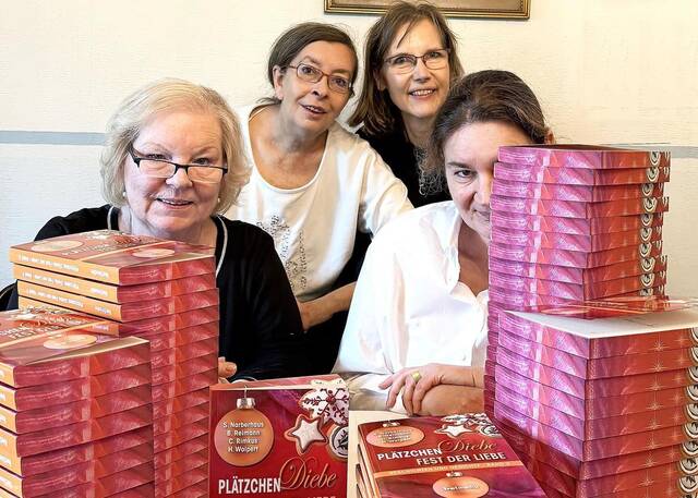 Heiter, besinnlich und kriminell geht es im Buch der vier heimischen Krimiautorinnen zu, die 28 Geschichten und Gedichte erdacht und zusammengetragen haben. „Plätzchen. Diebe. Fest der Liebe - Band 2“ ist der Titel des Buches, das für 13 Euro erhältlich ist. Die erste Auflage wurde mit einem festlichen Farbschnitt gedruckt und wer eines der besonderen Exemplare haben möchte, sollte es schnell in der Buchhandlung seines oder ihres Vertrauens bestellen.